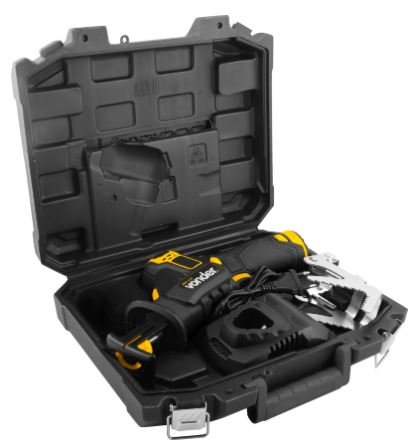 1 Serra sabre. Acompanha: 1 maleta, 1 lâmina, 1 apoio de corte, 1 bateria e 1 fonte de carregamento bivolt automático e 1 base para bateria.